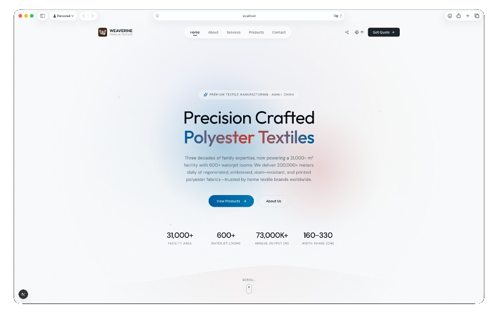 Weaverine(安徽五润纺织有限公司)是一家专注于高品质聚酯面料生产的现代化纺织企业,坐落于安徽省蚌埠市五河县经济开发区。公司传承自浙江长兴的家族纺织事业,拥有超过30年的行业经验。